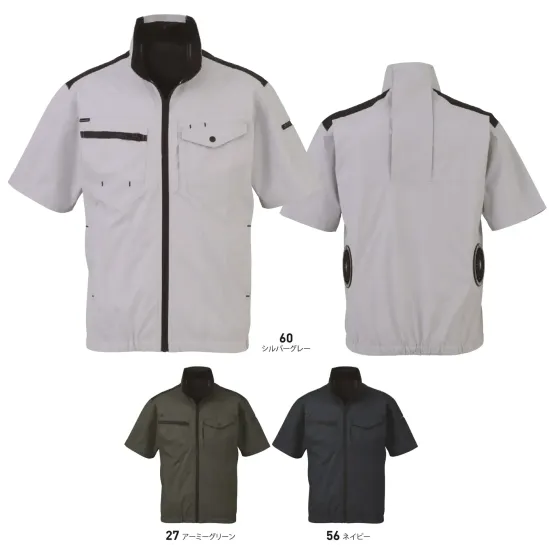 ・品番:EBA5138・商品名:半袖ジャケット・カラー:27.アーミーグリーン 56.ネイビー 60.シルバーグレー・サイズ:S~7L※本製品にファン・バッテリーは含まれていません。別途お買い求めのうえ、ご使用ください。