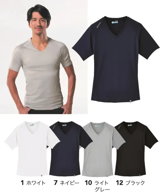 高機能冷却素材クールコア®を採用したVネックタイプの半袖インナーです。ポリエステル95%・ポリウレタン5%のストレッチ天竺素材が体の動きにしなやかにフィットし、吸水拡散機能により汗を素早く拡散して快適な着心地をキープ。通常のコンプレッションインナーよりややゆったりとしたルーズフィット設計で、作業時や日常のインナーとして快適に着用できます。