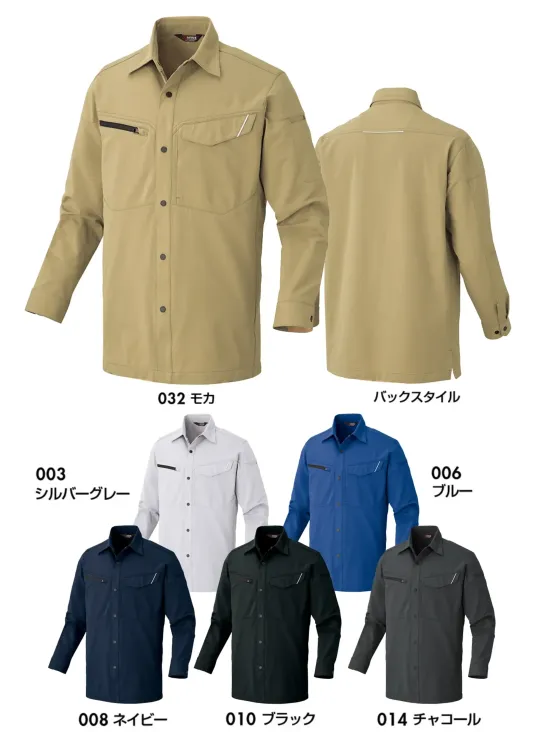 軽量でさらっとした着心地が続く全方向ストレッチ素材の長袖シャツ。吸汗速乾と通気性に優れたポリエステル100%素材に加え、全方向ストレッチで動きやすさを実現。UVカットUPF50や帯電防止JIS T8118適合により、快適性と安全性を兼ね備えた現場対応モデルです。