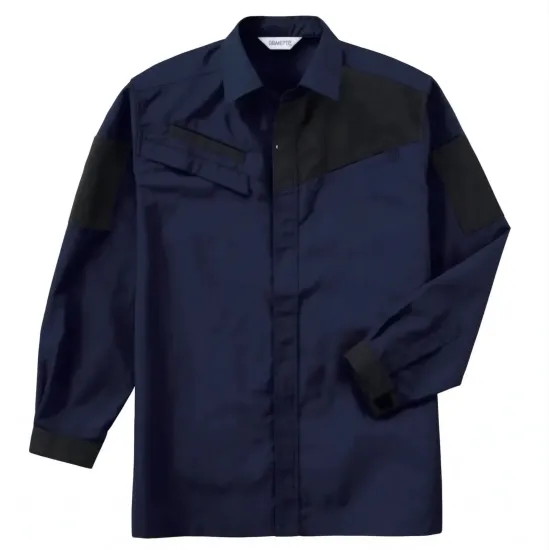 ・パーツの露出を抑えた防キズ仕様で製品や設備を傷つけにくい設計・胸にペン差し付きで現場作業に便利・第一ボタンをなくした首元らくらく仕様でストレス軽減・カフス部分はマジック仕様でフィット感を調整可能・スリムシルエットでスタイリッシュな着こなしを実現・パンツ(R1073/R1075)とのペアコーディネートが可能な統一デザイン