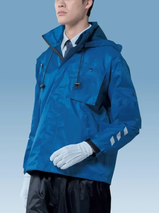 端境期から着用できるG6466 防風防水ブルゾンは、風雨をしっかり遮るPVCコーティング素材を採用した警備業務向けアウターです。ポリエステル100%の防風・防水仕様に加え、帯電防止機能も備え、天候が変わりやすい屋外現場でも安定した着用感と安全性を確保します。