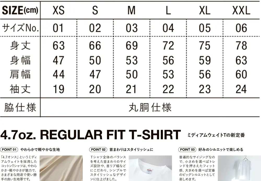 ・ステッチを省いたミニマルな首リブ・袖と裾は2本針仕様の上品な仕上がり・軽やかでちょうどいい4.7オンス生地・サイズ選びでトレンド感のあるフィットにもビッグにも対応・豊富なカラーで自在に着こなせる・4.7オンスのコットンTシャツで、幅広いニーズに対応・首まわりやリブ幅にもこだわり、シンプルでスタイリッシュなデザイン