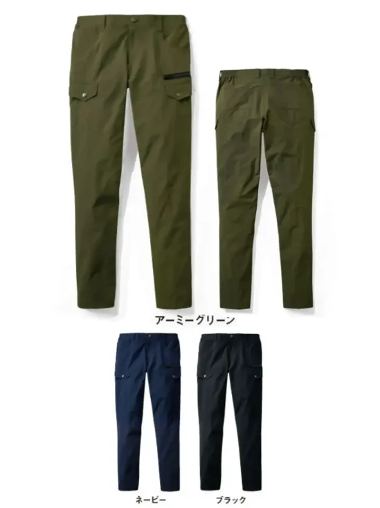 ・縦横に伸びる4WAYストレッチ素材で快適な作業性を実現・縦約24% 横約27%の優れた伸縮性でスムーズな動作をサポート・作業時の静電気を抑える帯電防止素材を採用・裾に向かって細くなるテーパードシルエットでスタイリッシュな印象・収納力に優れたカーゴポケット付きで作業効率アップ・ツール装着に便利なカラビナループ装備・ウエスト後ろ脇ゴム仕様で快適なフィット感・消臭抗菌テープでニオイ対策