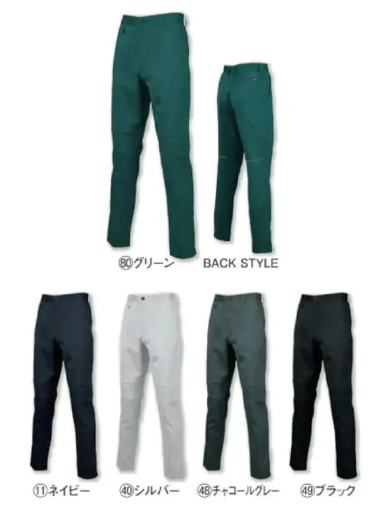 ・品番:31910・商品名:スラックス(ノータック)・サイズ:ウエスト70~120cm・股下:80cm・カラー:11ネイビー・40シルバー・48チャコールグレー・49ブラック・80グリーン・規格:JIS T-8118 制電対応