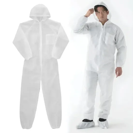 ・使い捨てタイプで常に清潔な状態を維持・軽量な不織布素材で長時間作業でも負担軽減・塗装・粉塵・清掃作業など幅広い現場に対応・フード付き仕様で頭部までしっかりカバー・前開き樹脂ファスナーで着脱がスムーズ・左胸と右後ろにポケット付き・袖口・裾ゴム入りで異物の侵入を軽減