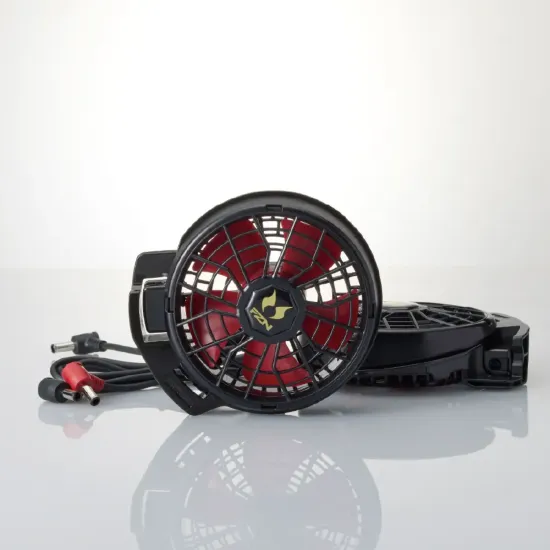 ・12V駆動による最大風量約4.1㎥/minのパワフル送風・ななめタイプのファン形状で衣服内に風を効率的に循環・1個あたり約100gの軽量設計で着用時の負担を軽減・厚さ約38mmのバランス設計で装着感と風量を両立・空調ウェア専用設計で安定した冷却効果を発揮