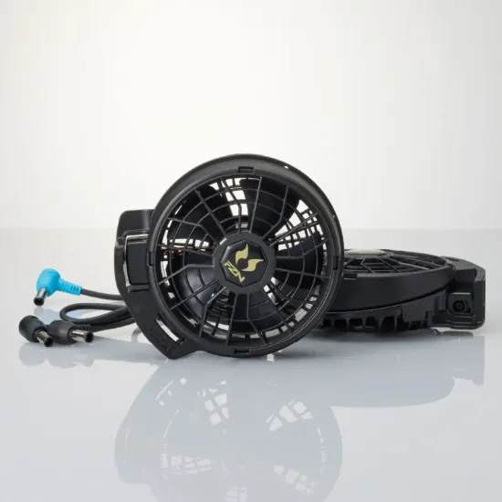 最大風量約6.0㎥/minを誇る24V仕様の高出力ファンセットです。ななめタイプのファン構造により 風向きを調整しながら衣服内へ効率的に送風。従来の12V仕様を大きく上回るパワーで 猛暑環境下の作業を強力にサポートします。