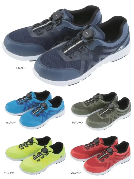 ・片手で簡単に調整できるダイヤルフィットシステム・高通気メッシュアッパーでムレを軽減し快適な履き心地・約290gの軽量設計で長時間でも疲れにくい・樹脂先芯を採用しつま先をしっかり保護・カラーバリエーション豊富で現場でも映えるデザイン