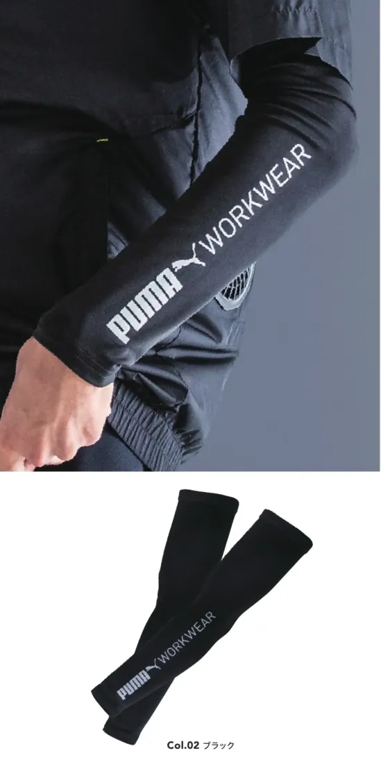 PUMA WORKWEARのパフォーマンスシリーズ 夏用コンプレッションアームカバーです。ナイロン87%・ポリウレタン13%のストレッチ素材。肘の内側にはメッシュ素材を配置し、作業中もムレにくく快適な着用感をキープします。