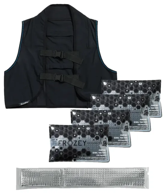 ファン付ウェアとの併用で冷却効率を高める高機能アイスベスト055。背中と両脇に保冷剤を装着できる4ポケットに加えネックアイスポケットを搭載。伸長率約40%の4WAYストレッチ素材が体に自然にフィットし動きを妨げず涼感をダイレクトに届けます。