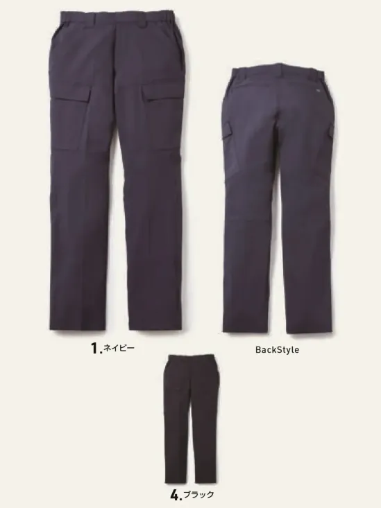 ・品番:U0788-08・品名:カーゴパンツ(ノータック、脇ゴム)・カラー:1.ネイビー 4.ブラック・サイズ:S~5L・シルエット:レギュラー