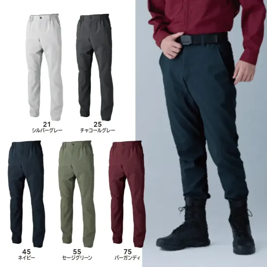 ・品番:7702・商品名:バイオライトフィックスパンツ・カラー:21 シルバーグレー 25 チャコールグレー 45 ネイビー 55 セージグリーン 75 バーガンディ・サイズ:SS~4L・平均重量:240g